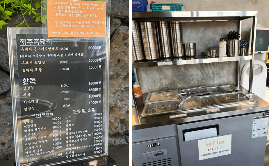 사진으로 보셨듯이 전체적으로 식당 인테리어는 제주스럽습니다. 반찬들도 깔끔하고 정갈합니다. 흑돼지와 삼겹살의 큰 차이는 모르겠으나 쫄깃함이 좀 다른 것 같아요. 두 개다 드셔보셔도 될 것 같아요.