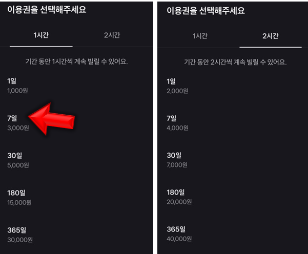 5. 이용권 1시간, 2시간 있고 정기권으로 1일, 7일, 30일, 365일 있습니다. 원하는 옵션으로 선택합니다. 저는 7일 3,000원으로 선택하겠습니다.