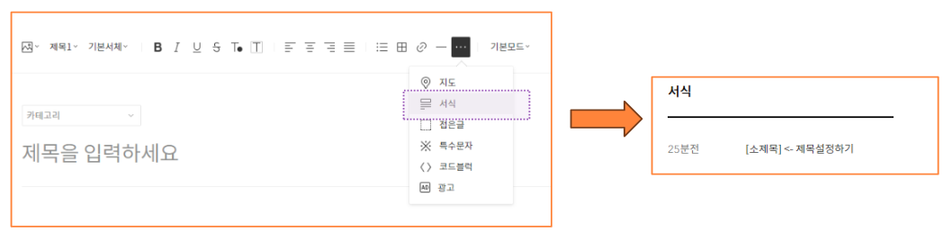 [5] 글쓰기를 누른 후 옵션 [더보기]에서 서식을 누르고 좀 전에 만든 소제목을 클릭하세요.