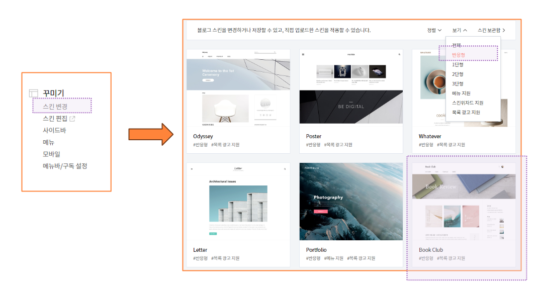1) 블로그 관리 -> 스킨 변경 -> 보기 -> 반응형 -> Book club 순서대로 눌러준다.