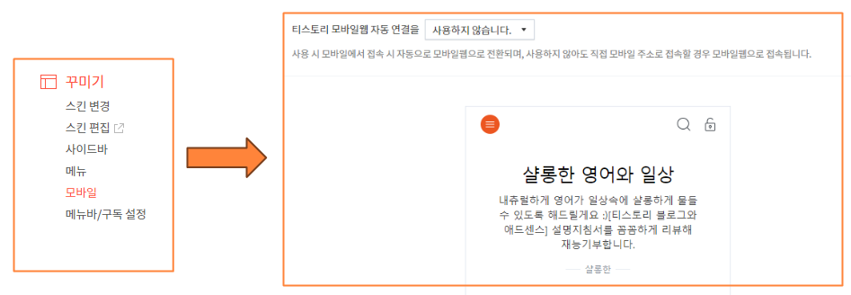 왜 모바일에서는 반응형 스킨을 했는데 그 스킨이 나타나지 않나요? 그건 티스토리 블로그에서 모바일 최적화를 시켜 속도를 빠르게 하려고 모바일 웹 자동연결을 기본적으로 하고 있습니다.