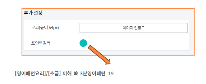 ▶ 추가 설정: 로고를 설정하고 싶으면 높이 64px에 맞춰 이미지를 업로드해줍니다. 포인트 컬러는 아래 그림처럼 메인 홈에 뜨는 글씨의 포인트 색깔입니다.