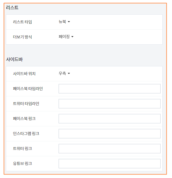 ▶ 사이드바: 메인 홈에 사이드바 위치 우측/좌측 2가지가 있어요. 원하시는 위치로 설정하면 됩니다. 그리고 트위터, 인스타그램, 페이스북, 유튜브 SNS가 있다면 링크를 삽입해도 된다.
