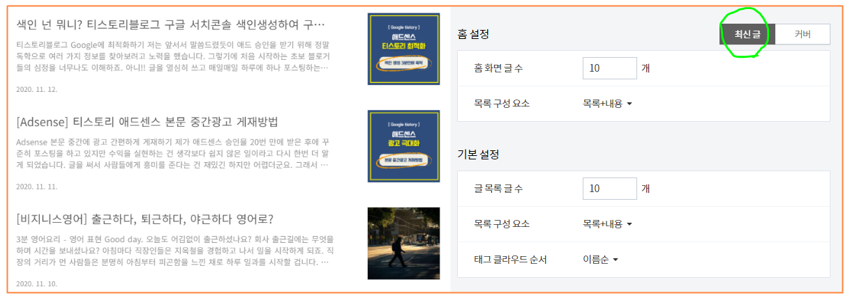 ▶ 홈 설정: 저는 최신글 순으로 해서 최신 글이 홈에 나타나게 해서 사람들이 순서대로 볼 수 있게 하는 게 효과적이라고 생각하여 설정했습니다. 개인적으로 전 최신 글로 하라고 말씀드리고 싶네요.