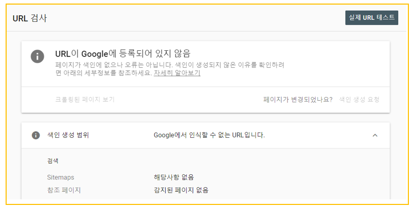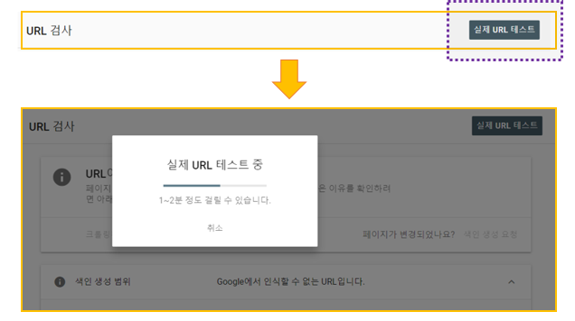 5) URL을 구글에 등록하려면 실제URL테스트를 클릭한다. 시간이 1분~2분 정도 소요된다.