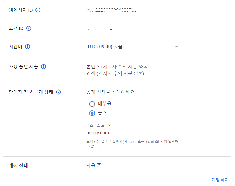 '판매자 정보를 Goggle seller.json 파일에 게재하시길 바랍니다. 현재 공개 상태를 검토하려면 계정 설정 페이지를 방문하세요'라는 메시지였다. 보아하니 작업만 진행해주면 문제가 없어 보일 듯 해 안심하긴 했습니다.