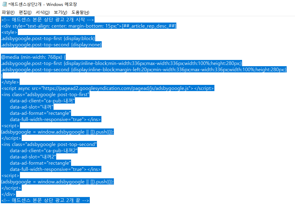 5) 첫 시작 시 다운받앗던 텍스트 파일을 메모장으로 엽니다. 아래 보이는 "ca-pub-내꺼"와 "내꺼"에서 내꺼를 본인이 만들어놓은 HTML 코드에서 찾아 본인거로 붙여 넣기 합니다.