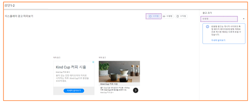 3) 광고 이름을 꼭 설정하고 (ex. 상단 1-1, 상단 1-2) 상단에 2개가 들어가야 하기 때문에 사각형 크기를 선택해주고 반응형을 꼭 선택하여 총 2개를 만들어 줍니다.