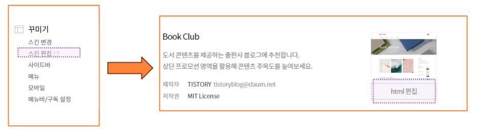 6) 붙여 넣었으면 다시 티스토리 블로그로 돌아와서 관리 -> 스킨 편집 -> HTML 편집 순서로 클릭합니다.