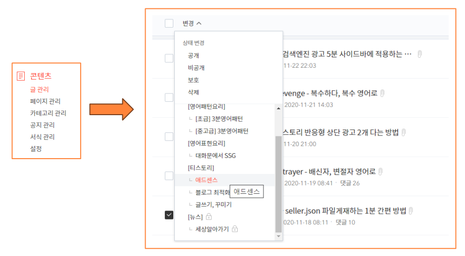 a) 이동시키고 싶은 글을 체크한 후 위에 변경을 누르고 옮기고자 하는 카테고리를 누르면 됩니다.