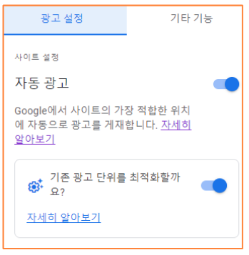 4) 자동 광고 설정을 클릭해주고 기존광고 단위 최적화도 눌러줍니다.