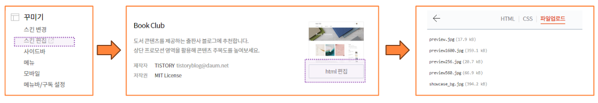 1) 본인 티스토리 블로그 관리-> 스킨 편집-> HTML 편집-> 파일 업로드 순으로 클릭해준다.
