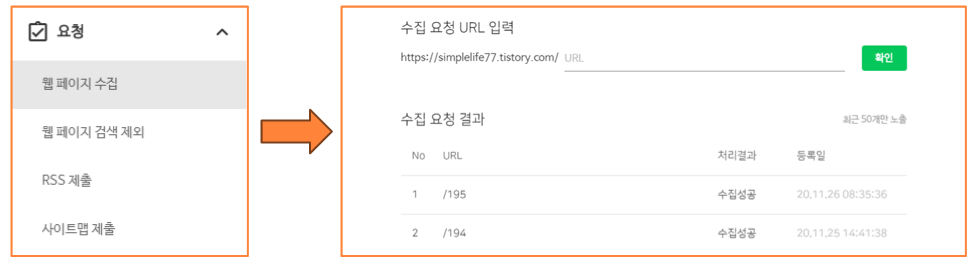7) 네이버서치어드바이저로 돌아와 요청->웹 페이지 수집->수집 요청 URL을 입력하게 되면 수집 성공이 됩니다.