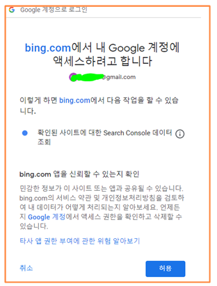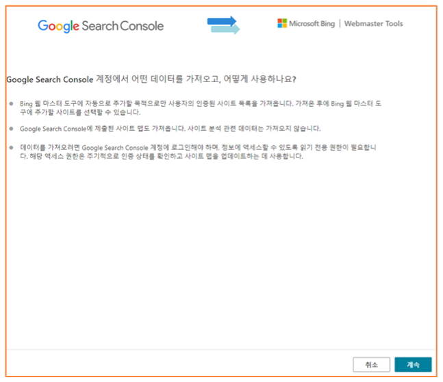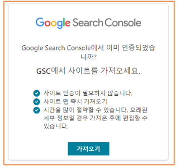4) 로그인을 하게 되면 하기와 같은 창이 뜨는데 가져오기를 눌러줍니다. 메시지 보시면 Google search console에 등록을 했기 때문에 인증되어서 가져오기만 누르면 되는 거죠. 그래서 꼭 Bing 사이트 등록 전에 서치 콘솔 먼저 해야 된다고 말씀을 드렸던 겁니다.