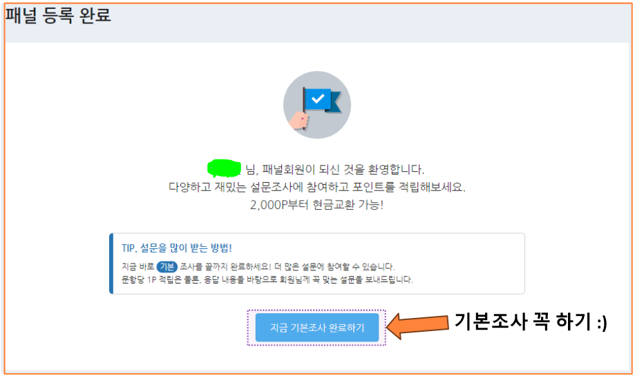 4) URL을 클릭하면 패널 등록이 완료가 됩니다. 여기서 중요한 점은 기본조사를 완료해줘야 본인이 해당될 만한 설문조사를 Panelnow에서 추천을 해줄 수 있습니다.