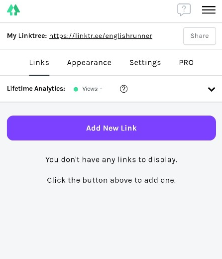 1) My Linktree란에 있는 링크는 보면 본인의 링크 트리 URL 주소입니다. Add New Link(새로운 링크 추가)를 클릭해줍니다. 링크는 본인의 SNS 및 블로그 URL을 추가해서 넣어줍니다.