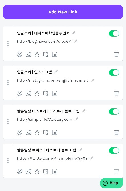 3) 아래는 제가 링크를 추가한 모습입니다. 뭔가 있어 보이죠? 오른쪽 상단에 슬라이드를 눌러주면 해당 URL ON/OFF 기능이 있습니다. 지우고 싶으면 당연히 휴지통 모양을 클릭해주면 됩니다.