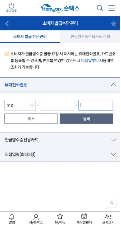 ▶ 현금영수증 발급수단을 클릭해줍니다.