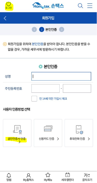 ▶ 회원이 아니라면 가입하고 공인인증서를 인증해서 로그인하고 회원이시면 공인인증서로 인증하여 로그인 해줍니다.