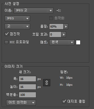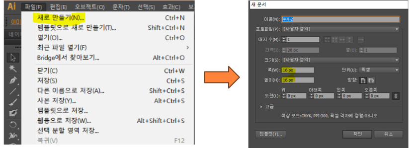 1) 새로 만들기(Ctrl+N)을 클릭하고 이름 설정 후 크기를 픽셀로 16px X 16px로 설정해줍니다.