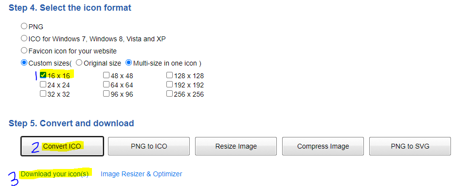 5) 파비콘의 사이즈는 16이기 때문에 16을 선택 -> Convert ICO(변환) -> Download your icon (다운로드 아이콘) 순서대로 진행해줘서 완료를 해줍니다.