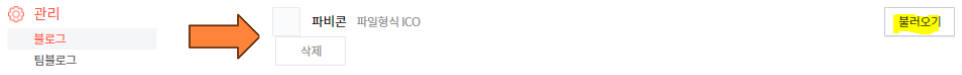 1) 티스토리로 들어와 설정 -> 관리 -> 블로그 -> 파비콘 불러오기 순서로 클릭해줍니다.