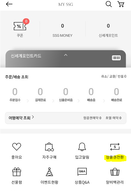 1) SSG(쓱) 앱을 실행 -> 로그인 -> MY SSG -> 상품권 전환을 눌러줍니다.