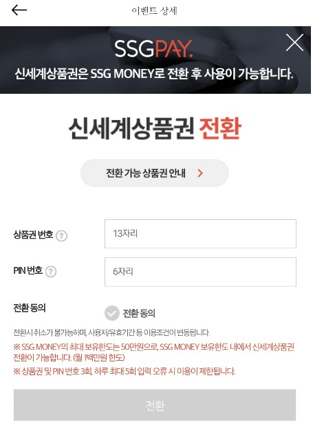 3) 신세계 상품권에 있는 번호와 PIN 번호를 입력 -> 전환 동의 체크 -> 전환을 눌러준다.