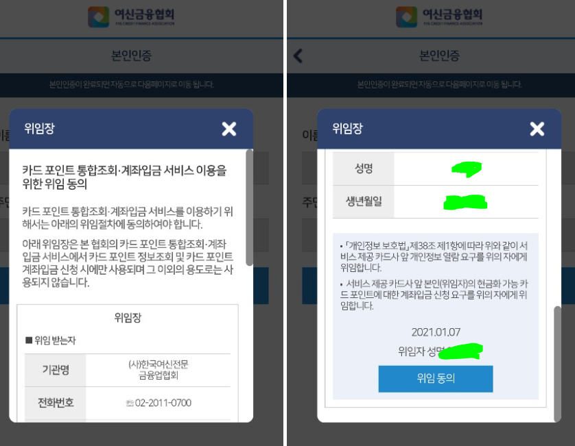 6) 카드 포인트 통합조회 계좌입금 서비스 이용을 위한 위임 동의를 해줍니다.