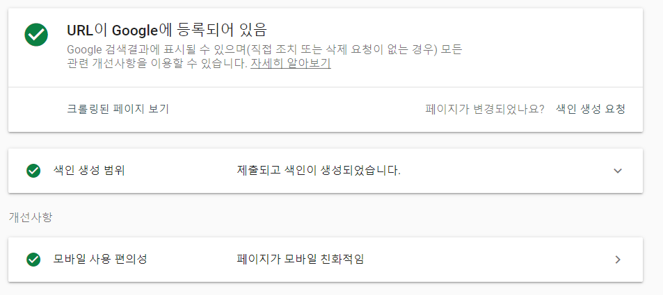 1) 구글콘솔에서 URL이 구글이 등록되어있는지 URL 검사를 해본다. 오류 페이지는 색인이 잘되어있고 페이지에도 친화적이라는 걸 볼 수 있습니다. 이상이 없어 보입니다.