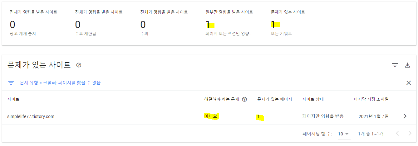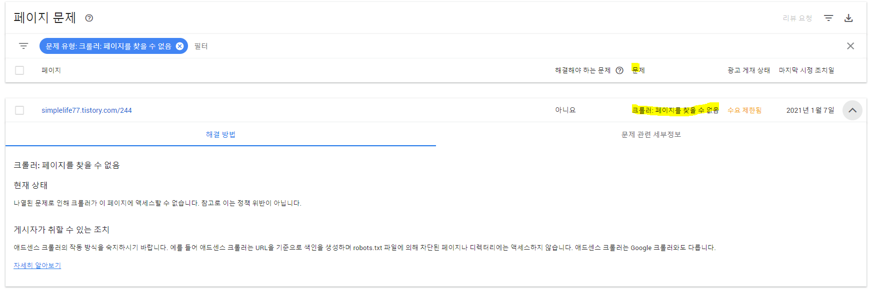 2) 저의 경우에는 해결해야 하는 문제가 '아니요'였고 문제가 있는 페이지는 1개만 받았죠. 왠지 분위기상 큰 문제는 아니라고 보입니다. 그래도 알아봐야죠 클릭해볼게요.