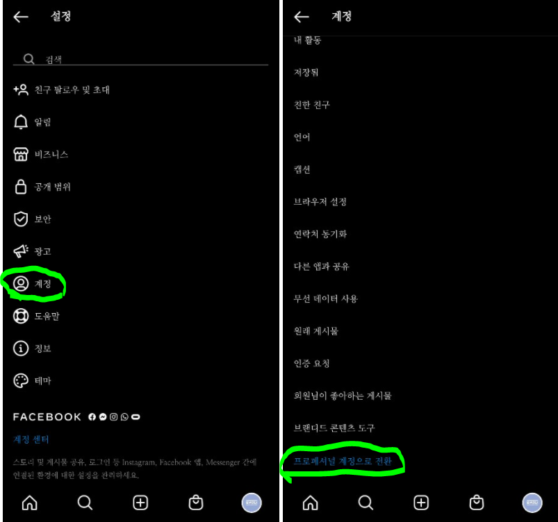 3) 설정에서 계정 -> 프로페셔널 계정으로 전환을 눌러줍니다.