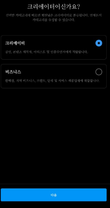 6) 크리에이터이신가요?라는 메시지가 뜨게 되면 크리에이터라고 클릭해줍니다 (인플루언서 활동을 원할 시) 하지만 인스타그램 아이디가 비즈니스 계정이라면 비즈니스로 클릭해줍니다.