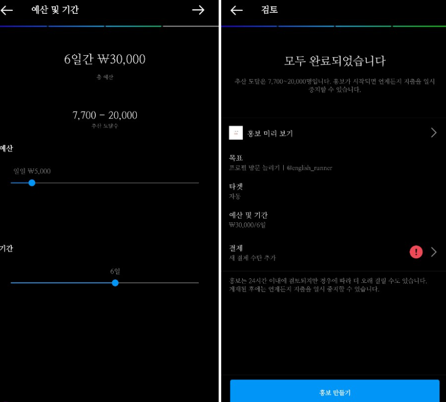 4) 홍보 만들기를 클릭합니다. 그전에 결제수단을 클릭해 예산을 지불할 수 있는 계좌를 추가합니다.
