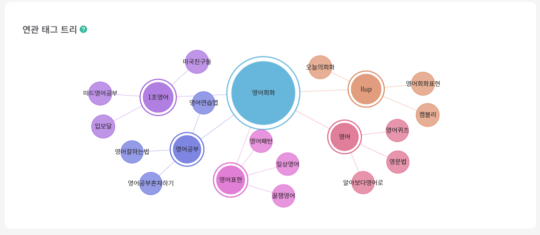 3) 해당 연관 태그 트리의 또 다음으로 큰 원들 중 하나를 고릅니다. 전 '영어 표현'을 고르겠습니다. 또 그러면 다음 단계로는 분석 시작해보겠죠. 이런 식으로 해서 인기 해시태그를 추출해내는 겁니다.