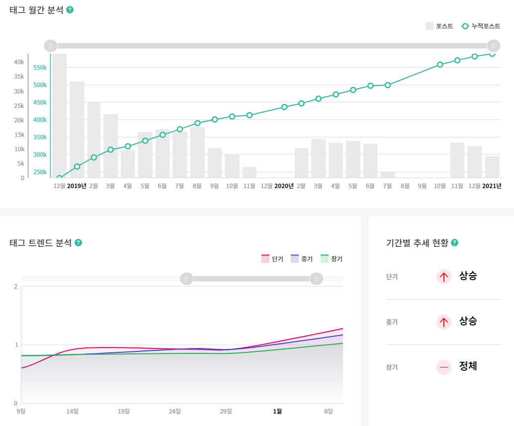 3) 예를 들면 저는 '영어공부'에 대한 키워드를 입력했습니다. 그랬더니 태그 월간 분석을 보면 인스타그램에서 영어공부 부 태그를 건 누적 포스트가 계속적으로 상승하고 있죠. 아직도 인기가 있다는 걸 분석할 수 있겠죠. 기간별 추세 현황도 나오니까 본인이 검색한 키워드를 꼼꼼히 볼 수 있을 것 같아요.