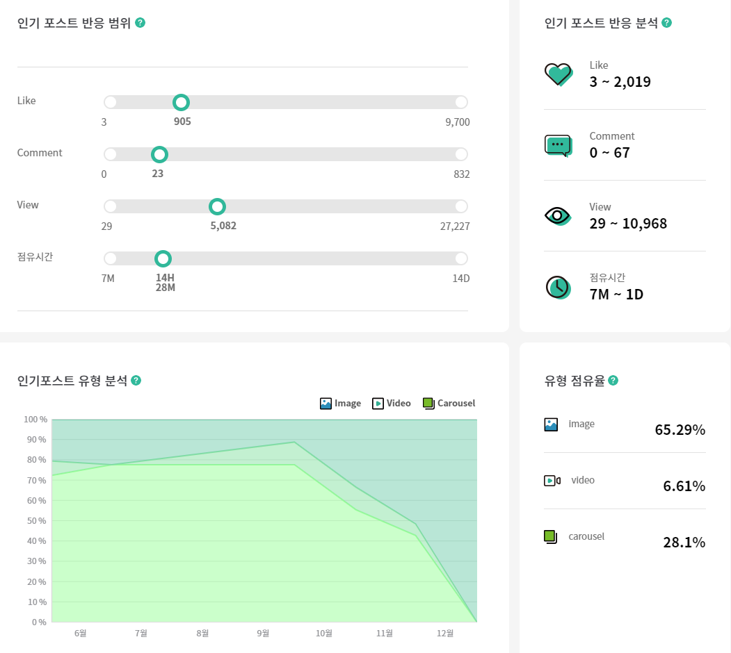 4) 스크롤을 내리면 인기 포스트 반응 범위가 있는데 반응 범위란 뜻은 '좋아요'를 누르거나 '댓글'을 다는 등의 행동을 말하는 거죠. 보면 점유시간도 나와있어 정말 디테일합니다. 유형 점유율 즉 사진인지 동영상인지 등을 보여줍니다.