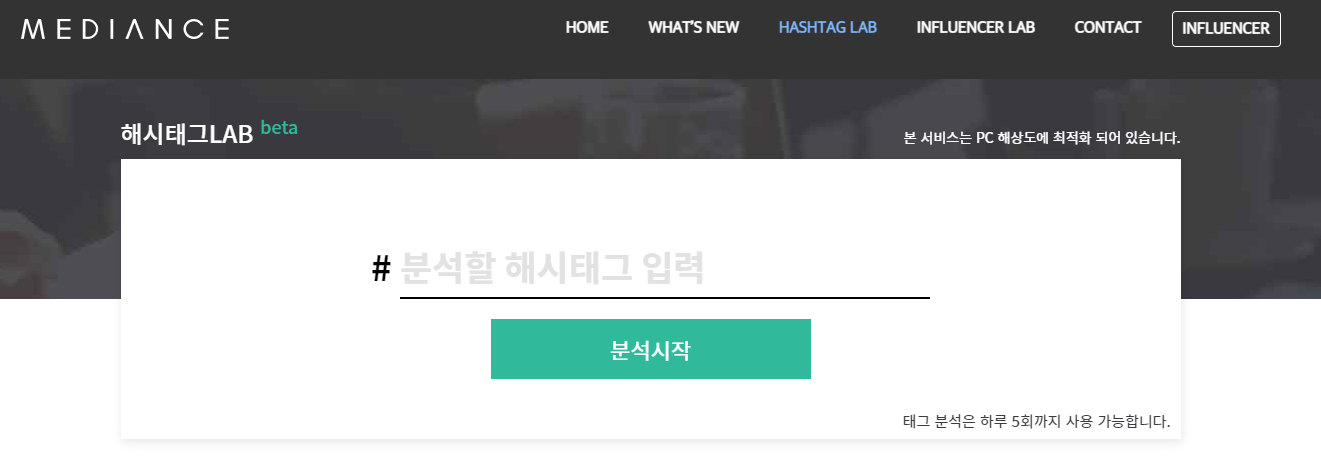 인스타그램에서 # 해시태그(hashtag)를 아시죠? 특정 단어 앞에 #기호를 꼬리표처럼 붙여 그 정보를 공유하는 방식입니다. 해시태그 랩에서는 누적 100만여개의 hashtag 데이터를 실시간으로 분석해서 해시태그 트렌드와 연관된 해시태그를 검색하여 확인할 수 있는 사이트입니다.