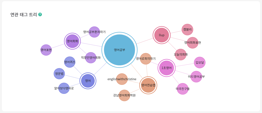 저 같은 경우 연관 태그 트리를 적극적으로 활용하는 편입니다. 정말 중요하다고 볼 수 있어요. 이게 제일 활용도가 높다고 생각해요. 마인드맵처럼 관련 있는 키워드를 실시간으로 검색해서 보여주는 거죠. 참고해서 여러 가지 해시태그를 본인의 글에 다는 게 효율적으로 방문자의 유입량이나 팔로워를 늘릴 수 있는 역할을 하게 되는 거죠.