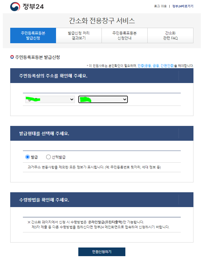 4) 주민등록표등본 발급 신청을 위해 주소를 입력 -> 발급 형태 선택 -> 민원 신청하기 순서로 클릭해줍니다.