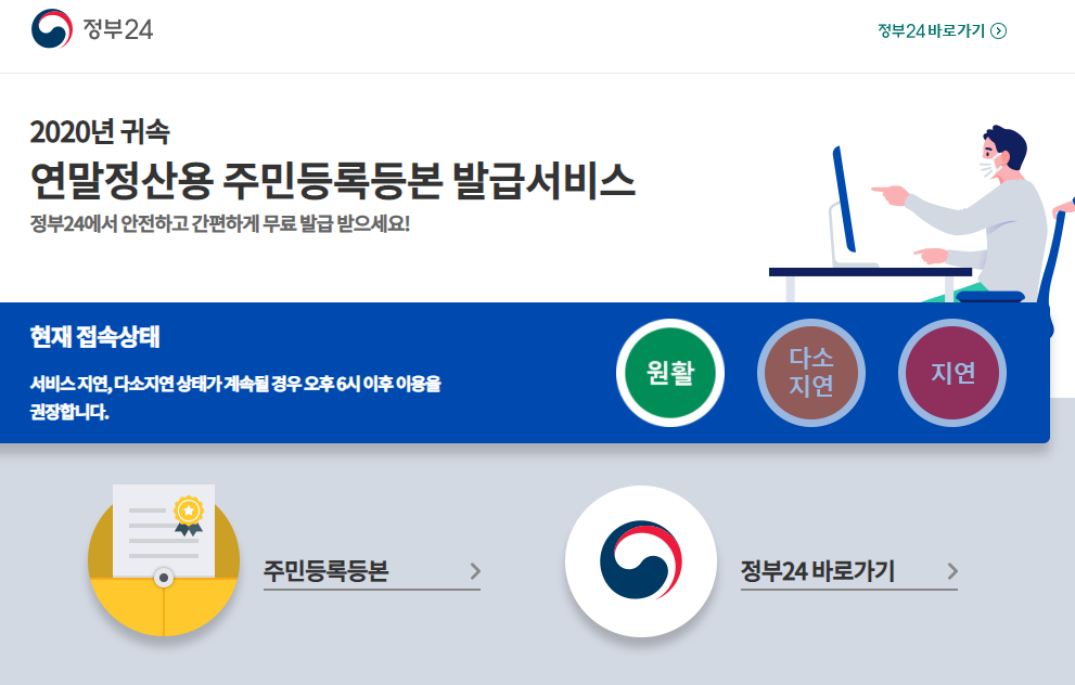 2) 워낙 많이 사용되기도 하고 지금은 연말정산 기간이라 연말정산용 주민등록 본 발급 서비스가 메인 홈페이지에서 나오네요. 그렇다면 더 금방 하겠죠. 주민등록등본을 눌러줍니다.