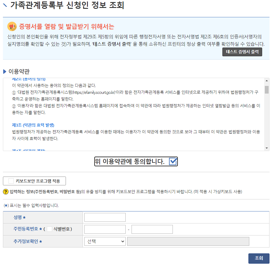 3) 가족관계등록부 신청인 정보 조회를 위해 이용약관에 동의를 해주고 요구하는 정보를 입력 후 '조회'를 눌러줍니다.