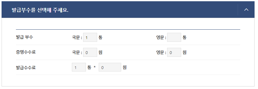 6) 발급 부수와 언어 선택(국문 or 영문) 선택해주세요.