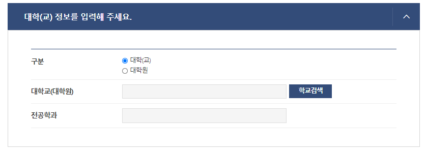 5) 대학교 or 대학원 구분을 선택해주고 대학명을 학교 검색에서 찾고 전공학과를 입력해줍니다.