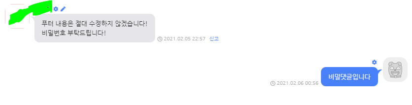 3) 친효스킨을 다운로드할 시 꼭 지켜야 하는 규칙이 있는데요. 스킨의 푸터를 절대 수정하지 않겠다는 댓글을 달아주시고 절대로 비공개로 댓글을 작성하시면 안 됩니다. 그림처럼 글 하단에 댓글을 작성하시면 됩니다. 그러면 효자손님께서 비밀번호와 함께 피드백을 주시죠.