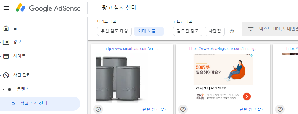 2) 이번엔 차단 관리 -> 광고 심사 센터 순으로 눌러줍니다.
