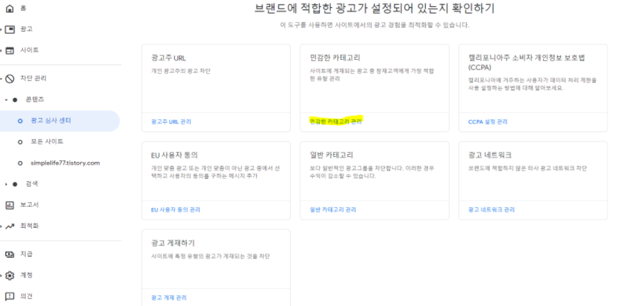 2) 광고 -> 모든 사이트 -> 민감한 카테고리 관리 순서로 눌러줍니다.