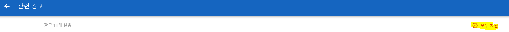 4) 저 같은 경우는 아주 골칫덩어리 성인 웹툰 탑툰을 검색해서 삭제할 거예요. 해당 건의 관련 광고 찾기를 눌러줍니다. 그러면 관련돼서 광고들이 뜨겠죠. 총 11개가 나오네요. 오른쪽에 모두 차단을 클릭해주면 됩니다.