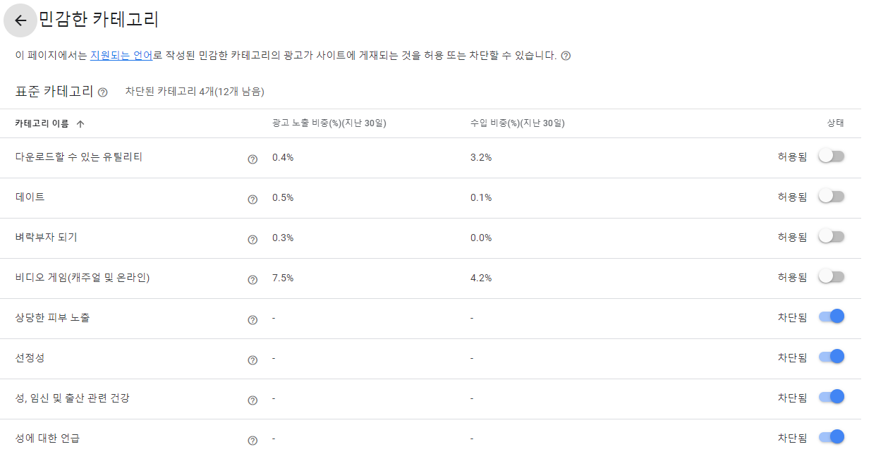 3) 민감한 카테고리에서 선정성 있는 상당한 피부노출 및 노골적인 광고가 게재되는 걸 원하지 않는다면 상태에서 슬라이드를 클릭해줍니다. 그러면 허용됨->차단됨으로 변경이 되며 애드센스 광고엔 그런 노골적이고 선정적인 광고들이 노출되지 않을 겁니다.