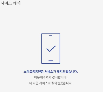 6) 아래 팝업이 뜨면 스마트 공동인증 서비스가 해지완료된겁니다.